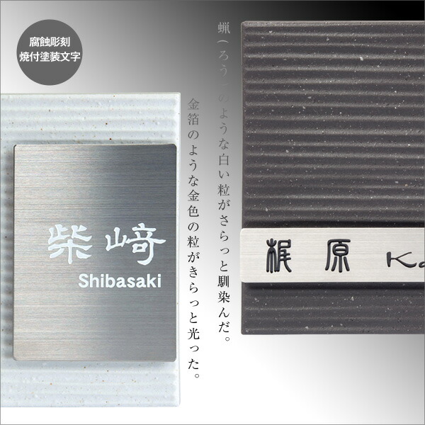凹凸のあるウェーブタイルに、ステンレス板を3mm程度浮かせ立体的なフォルムをもたせた新感覚の表札です。